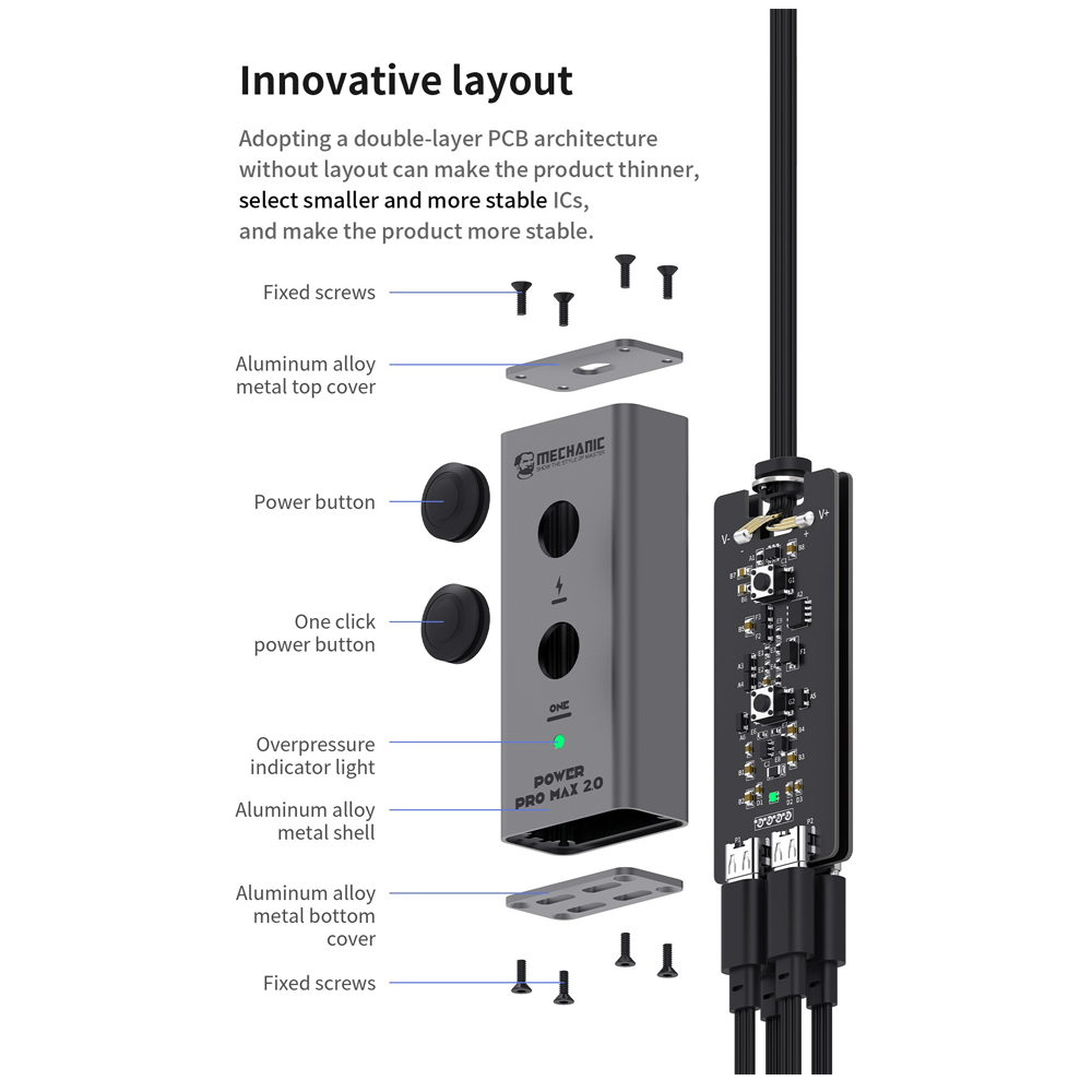 The Mechanic Power Pro Max 2.0 boot cable for iphone x to 15 Pro Max features a slim design with a double-layer PCB, four type-c interfaces, and intelligent voltage prompts. It offers high stability, easy startup with a double connection seat, and accurate data detection with a bold copper wire core.